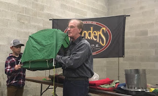 We returned to the the QAS and seated ourselves in the Grand Room to attend Cliff Jacobson's first of two presentations. This one was on camping tip's and tricks. As we entered the room Hiker immediate positioned himself in a seat at the front of the room right in front of where Cliff would be presenting. This turned out to be a wise decision as during the presentation Cliff asked Hiker to join him in helping with the presentation. Hiker was required to hold a miniature tent so that Cliff could go over key materials and proper ways of choosing and setting up a tent that could withstand heavy rain and wind.